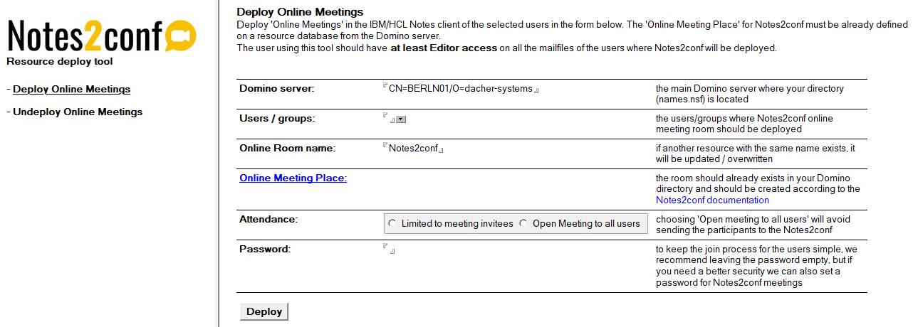 The Notes2conf deploy tool is a Notes database designed for HCL/IBM Notes administrators to automatically create the Notes2conf 'Online Meeting' room in the mail files of the users. Using this tool eliminates the need to instruct your Notes users to manually create the Notes2conf 'Online Meeting' room as described in the 'HCL/IBM Notes client configuration' section of the Notes2conf documentation. Click here to download the Notes2conf deploy tool.
