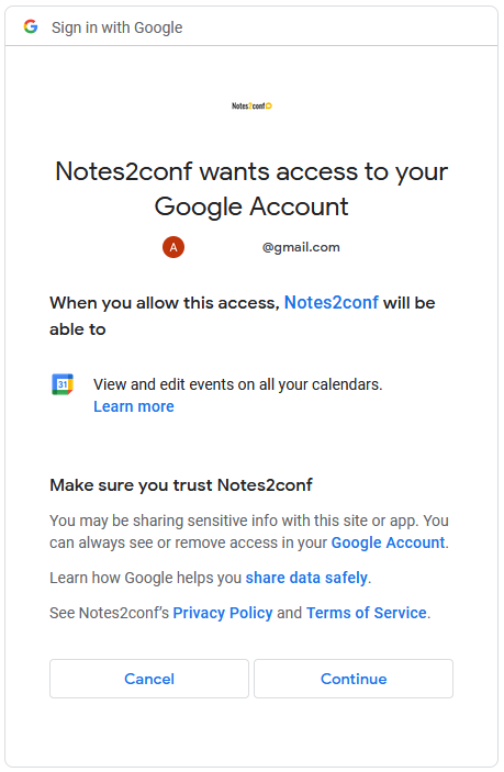 When you will create a Google Meet conference, you will be asked to login with a Google account. Notes2conf is using Google Meet API to automatically create conferences for you.