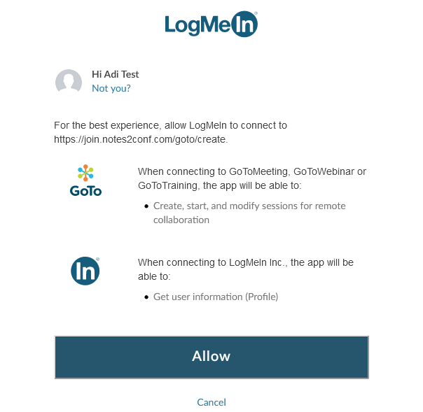 When you will create a GoToMeeting conference, you will be asked to login with a GoToMeeting account. Notes2conf is using GoToMeeting REST API to automatically create GoToMeeting conferences for you.