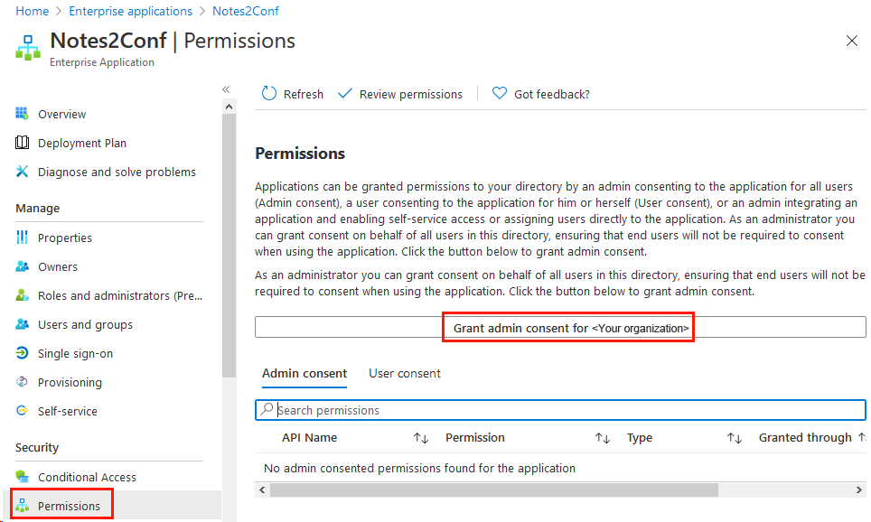 2. Sign in to the Azure portal with a Global Administrator, an Application Administrator or a Cloud Application Administrator account. Go to Azure Active Directory then Enterprise applications and select the Notes2Cont app. Select Permissions and then click Grant admin consent, as shown in the image below.
