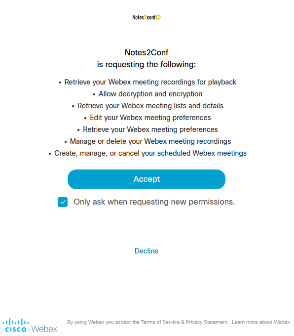 Review the requested permissions and click "Accept" to grant consent for all the users in your organization. Detailed instructions about granting admin consent in Enterprise apps can also be found here: https://docs.microsoft.com/en-us/azure/active-directory/manage-apps/grant-admin-consent. Configure admin consent workflow for organizational accounts If granting admin consent for all users is not suitable for your organization, you can also configure the admin consent workflow. This will allow an administrator to manage which users in your organization can use the Notes2conf app. Detailed instructions about configuring the admin consent workflow can be found here: https://docs.microsoft.com/en-us/azure/active-directory/manage-apps/configure-admin-consent-workflow. Webex app